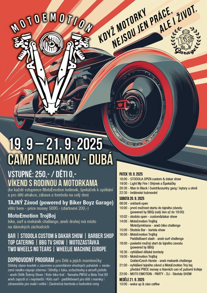 👉 Součástí vstupenky je originální kelímek MotoEmotion, špekáček k opékání a celodenní program pro děti.